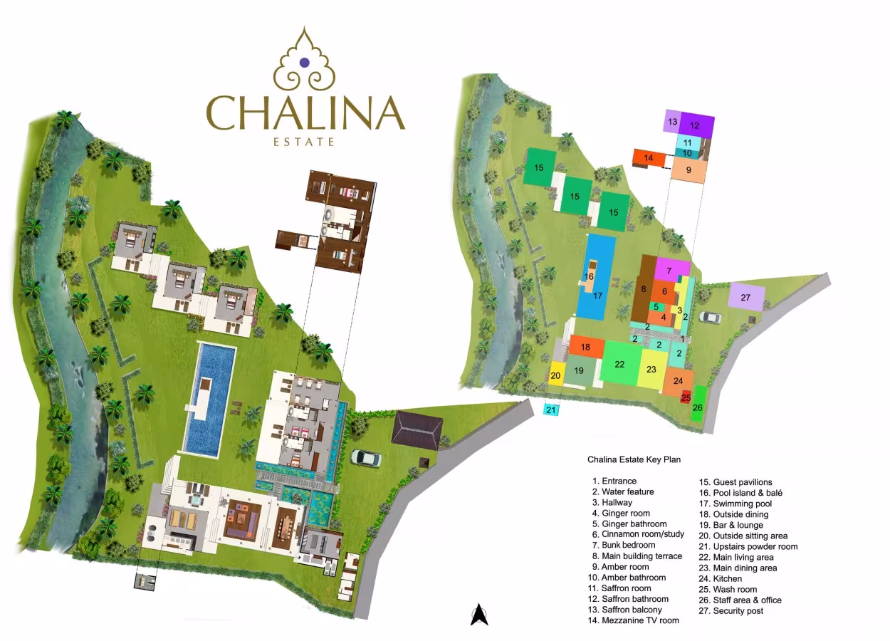 Construite autour d’un vaste jardin et d’une piscine centrale sur un terrain de 5 300 m² avec une vue imprenable sur la campagne, Chalina Estate est bordée par la pittoresque rivière Pangi sur deux côtés, créant un sanctuaire paisible et privé avec des équipements de luxe. Son cadre idyllique en fait une villa parfaite pour des vacances inoubliables, des retraites et des célébrations de toutes sortes.