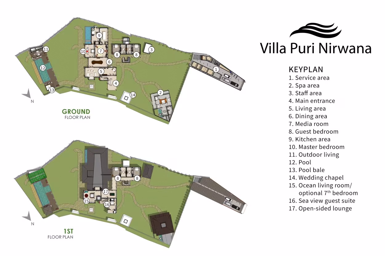 Les principaux espaces de vie, la suite principale et une chambre d’amis occupent un bâtiment contemporain face à l’océan, relié au pavillon de chambres Garden Wing à l’arrière. L’entrée majestueuse mène à un espace de réception ouvert, donnant accès à la salle à manger qui s’étend sur toute la longueur du rez-de-chaussée, avec le salon principal d’un côté et la suite principale ainsi que la salle multimédia (dotée de portes-fenêtres menant à la cuisine) de l’autre. Depuis l’entrée, un escalier mène à un salon ouvert, un espace de vie avec vue sur l’océan (qui peut être transformé en une septième chambre) et une suite d’invités avec vue sur la mer. Des vérandas à colonnades relient ce bâtiment au Garden Wing, où deux chambres d’amis avec salle de bain attenante se trouvent à chaque étage, accessibles par un escalier et un ascenseur. Un pavillon Joglo indépendant, niché dans les jardins tropicaux, abrite le spa de la villa, tandis que la piscine, le solarium, le balé et le pavillon de restauration se trouvent en bord de mer.